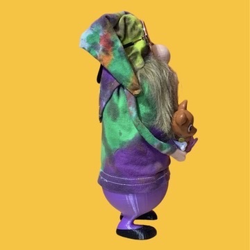 Peep his vibrant purple duds, man – solid purple pants and a matching pouch where his little furry dog friend hangs loose. Grimble Gromble ain't just a gnome; he's a whole vibe! Bring home the good karma, baby, and let the flower power flow!