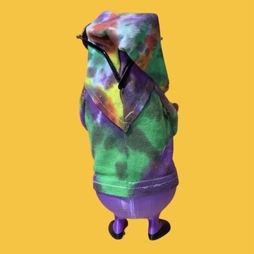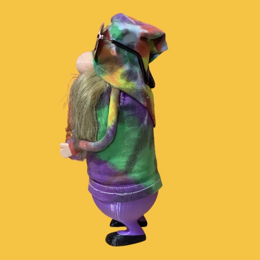 Peep his vibrant purple duds, man – solid purple pants and a matching pouch where his little furry dog friend hangs loose. Grimble Gromble ain't just a gnome; he's a whole vibe! Bring home the good karma, baby, and let the flower power flow!